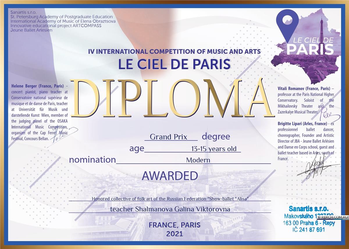 Танцевальный коллектив "Алиса" получил диплом французского конкурса.