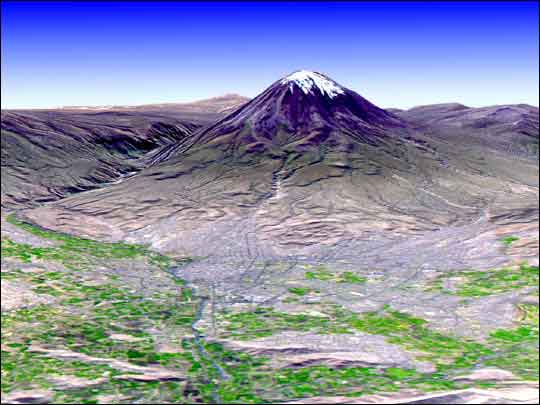 / JAROS, and U.S. / Japan Cette vue en trois dimensions a été créée à l'aide des données d'un satellite. Le Modèle de l'Élévation Numérique est combiné avec une image de l'ASTER (Émission Thermique et Radiomètre de la Réflexion) et simulée avec la couleur naturelle.. Il montre le volcan Misti qui domine à 5 822 mètres au-dessus de la deuxième ville du Pérou, Arequipa, avec une population de plus qu'un million. Les études géologiques indiquent que le Misti a eu cinq éruptions mineures ce siècle, et une éruption majeure au 15ème siècle quand les habitants ont été forcés à fuir la ville. En dépit du hasard, les autorités de la défense civiles le voient comme un danger éloigné, et les planificateurs de la ville n'évitent pas le développement de la ville sur le côté du volcan . Cette vue montre le développement humain qui s'étend en haut des flancs du volcan le long de ravins qui formeraient des canaux naturels pour les courants de lave, de la cendre très chaude et asphyxie, ou de la glace fondu , de la neige, et de la boue de neige du sommet lors de l'événement d'une éruption.