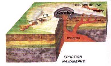 LES DIFFÉRENTS TYPES D'ÉRUPTIONS Eruption hawaïenne Si la lave est très fluide, elle jaillit en fontaines, s'étale en