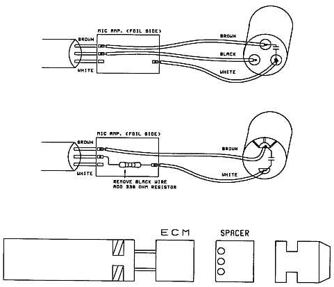 The new Mic element for an MC-55 comes in two pieces. One piece is a two pin ECM and the other piece is a spacer. The spacer is required as the new ECM is half the side of the old one. The wiring configuration is somewhat changed for the installation of the new Mic element. The figures below show the original configuration, the new configuration, and the assembly. The black wire is not used with the new ECM and a 330 ohm resistor is installed on the foil side of the microphone amplifier board. The leads of the resistor should be insulated with electricians tape or shrink tubing.
