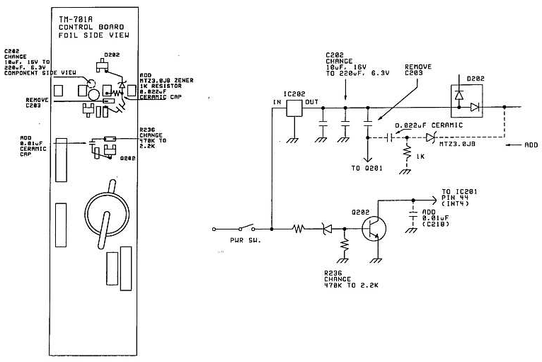 Some TM-231A owners have reported that the transceiver intermittently loses its memory channel information at power on. The following modification will absorb pulses on the CPU interrupt line (INT4) and reconfigure the backup switching circuit to avoid unintentional memory loss.