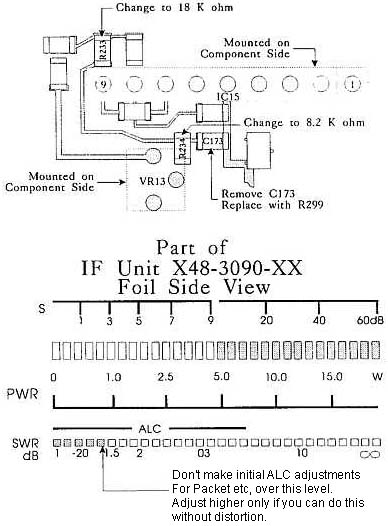 remove the connectors on the right hand side of the IF board (underside transceiver front towards you). Unscrew the board and fold over to the left. Add 22 nF parallel to R282 1k on t he micro entry close to Connector 6. Add 1nF parallel to C177 close to the IC-15 input. Add 1nF parall el to C217 close to the vox amplifier.