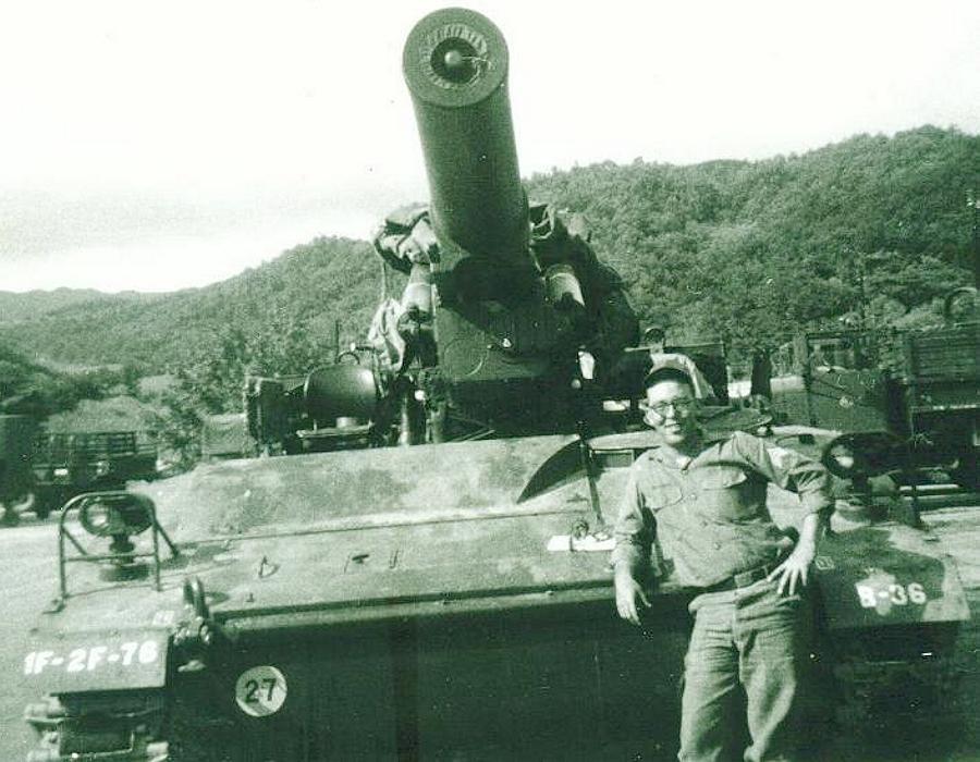 This is me at our Detachment at Cp St Barbara standing in front of one the 2/76 M110 8 inch SP. I know I did a lot of partying while in Korea, but I do not remember being a Buck Sgt. I was a Sp5 63C Mechanic when I arrived in Korea, and was promoted to SP6 as a 63H30 Tech Inspector. Some how, I ended up being a buck sgt in between. :)