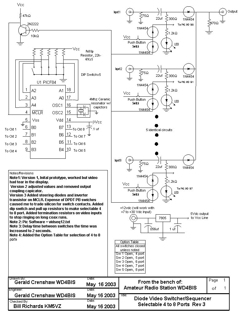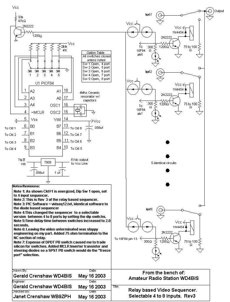This device cycles the video output from multiple cameras to a video monitor and/or long timelapse VCR. I made this for a project at work and later expanded it to more inputs as the system and need for coverage increased. Typical commercial sequencers are made in 4 or 8 port only. I made two versions of this device, one is a relay based sequencer, and the other is a switching diode based sequencer. Both of these are selectable from 4 to 8 input ports via dip switch settings. The software in the PIC has gone through several extensive revisions until I arrived at this version that was ideal for my application. Time delay between switches is now 2 seconds. The PIC/software is interchangable between the both devices.