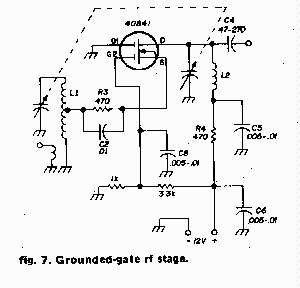 "Fig. 7 shows the circuit for a grounded-gate rf stage. Note that gate 2 must still be biased to +4 volts for full gain. You can feed gate 2 from the agc line if desired. This stage is very stable without much shielding."