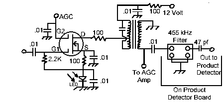 The original inspiration for this IF strip came from the "Progressive Communications Receiver" in most of the recent ARRL Handbooks. That circuit is used at 9 MHz, uses two stages, and uses an LED (or two diodes in series) to raise the circuit ground of the MOSFETs. It is also a broadband circuit and could be used at any IF frequency given the limitation of the ferrite cores used. AGC performance falls with higher frequencies (10 MHz to 20 MHz), but works very well for 9MHz and below. The Cadillac of all MOSFET IF strips is "A Universal MOSFET IF Amplifier", by Georges Ricaud, and Doug DeMaw, QST, August 1981, Page 27. This circuit uses large red LED's which on the author's batch gave a 2.1 volt reference for the sources. He has two different AGC outputs, one that can be used at the RF amplifier or at the post mixer amplifier in this LED MOSFET receiver. The idea of using a 100 resistor in series at the drain was used in this receiver instead of swamping the output coil with a 2.2K resister like in the Progressive Communication Receiver. Ricaud's circuit uses a series 100 ohm resistor at G1 as well as at the drain. This is a great idea for using the MOSFET at higher frequencies, i. e., like the 9 MHz that Ricaud's circuit is designed. He uses a MC1350 AGC amplifier, which is needed for great AGC action at 9 MHz. You would want to use this circuit if you wanted to design a single conversion MOSFET receiver, instead of the dual conversion scheme of the LED MOSFET receiver. Another MOSFET IF strip worth looking at is "DX Receiver for the Ham Bands", by Ovi Florea, Ham Radio, December 1976, Page 10. His MOSFET amplifiers used a minimum of parts with 455 kHz Radio Shack cans, but does not reference the sources above ground, or use any 'oscillation tamers' (swamping resistors or ferrite beads) on the MOSFETs. I have found that when source resistors of 270 to 470 ohm are used, that the gain of the mosfets are considerably lower over the 100 ohm source resisters used in LED MOSFET receiver. This may be how he gets away without the "oscillation tamers". The need to have to supply a negative voltage for the AGC circuit makes this circuit obsolete.