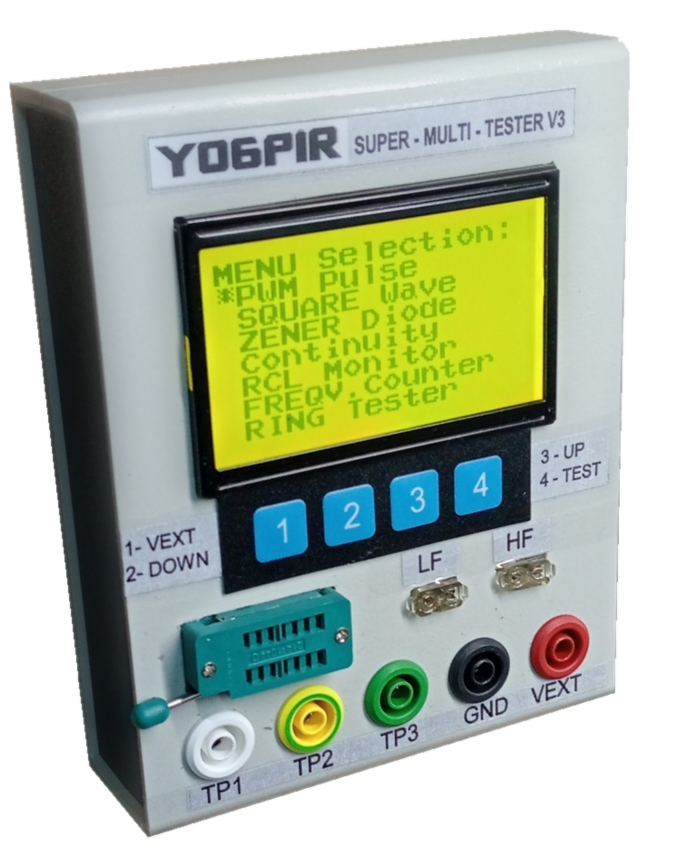 Testerul universal de componente cunoscut sub numele de SUPER MULTI TESTER a aparut de-a lungul timpului in nenumarate variante. Eu detin din 2009 varianta initiala cu afisaj alfa-numeric 2x16 caractere, SMT-1. Intre timp am mai construit si o varianta de buzunar denumita de mine TT-MINI. Acum am construit si o varianta care inglobeaza mai multe functii de testare si totodata este mai compact, asemanator cu un multimetru universal. Deasemenea este alimentat de la o baterie interna si din acest motiv este si portabil.