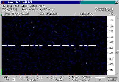(Generated using the internal beacon.)1F 11 12 1B 17 1F 19 16 07 04 00Take a look at the MFSK example at the top of this page - the stuff to the right of the text is "ZL1BPU " in "Murray" mode. Although they look really cool, the MFSK modes are much less sensitive than ASK or FSK modes, since in general less time is spent on each dot. However these modes are MUCH faster - perhaps three times as fast as ASK Morse. MFSK works best at one ARGO speed slower than the other modes.The Mode commands are very useful for transmitting messages in several different modes, one after another. Remember to set the sending speed as necessary to suit the mode in question (to give best ARGO readability, for example). The message in each mode needs to be recorded separately after the mode command. Periods of key-up or key-down silence can be transmitted using the HELL mode (Mode 5 or F5), using a very slow baud rate for long delay periods.