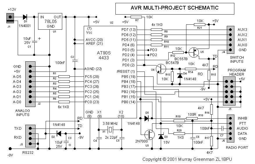 The keyer is based on an AVR AT90S4433 processor running at 3.58 MHz. Take a look at the Schematic, and see the Specifications for more detail.Port C of the micro is used for analog inputs which are reported as telemetry in the beacon message, and can be configured for a range of sensors.