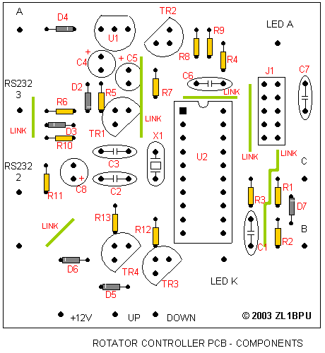 Mechanical parts are not shown. Other miscellaneous wires, insulated links and mounting hardware will be required to suit the installation. A 1m 3-core screened cable is suggested for the RS232 connection. The microcontroller U2 should be socketed. Four insulated mounting pillars with 3mm nylon nuts and bolts are used to hold the board into the enclosure.CCT REF PART DESCRIPTION C1 1u0 25V Mylar film capacitor C2 C3 27p 50V Ceramic plate capacitor, NPO C4 C5 C8 10u 25V Al electrolytic, radial lead C6 C7 100n 50V Ceramic monolythic - 10n 50V Ceramic (fit across R2 in case of RF instability) D1 LED RED High brightness 3mm LED (optional) D2 D3 D5 D6 1N4148 Diode, silicon signal D4 1N4002 Diode 1A 200V power D7 BZX85C5V1 Zener diode 5.1V 400mW J1 2x5 HDR Two row 2.54mm pitch header, 2 x 5 pins J2 DB9F RS232 connector, female, with cover (not shown on schematic) K1 K2 12V CO 12V 1W 1PCO relay 10A 120V AC contacts (not shown on schematic) R1 1k0 - 4k7 5% 0.25W Select on test to give about reading of 0xB4 when rotator fully clockwise The best answer is to use a 1k resistor and a 10k trim pot (not on the PCB) R2 R3 R5 R6 10k 5% 0.25W R4 1k5 5% 0.25W R7 R10 4k7 5% 0.25W R8 R9 R12 R13 10k 5% 0.25W R11 100R 5% 0.25W S1 DIL20 0.3 in Socket, DIL IC TR1 BC547B Bipolar NPN transistor TR2 BC557B Bipolar PNP transistor TR3 TR4 BC337B Bipolar NPN transistor, 100mA U1 78L05 Regulator, 5V 100mA U2 AT90S2313-10PC Micro controller, ATMEL 10 MHz DIL X1 4.0 MHz HC-23U Microprocessor crystal