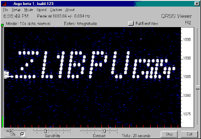 (Generated using the internal beacon.)1F 11 12 1B 17 1F 19 16 07 04 00Take a look at the MFSK example at the top of this page - the stuff to the right of the text is "ZL1BPU " in "Murray" mode. Although they look really cool, the MFSK modes are much less sensitive than ASK or FSK modes, since in general less time is spent on each dot. However these modes are MUCH faster - perhaps three times as fast as ASK Morse. MFSK works best at one ARGO speed slower than the other modes.The Mode commands are very useful for transmitting messages in several different modes, one after another. Remember to set the sending speed as necessary to suit the mode in question (to give best ARGO readability, for example). The message in each mode needs to be recorded separately after the mode command. Periods of key-up or key-down silence can be transmitted using the HELL mode (Mode 5 or F5), using a very slow baud rate for long delay periods.