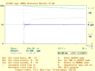 Short Term Stability Performance of prototype unit using CFPO-DO3 OCXOThe serial data can be used for time and performance logging, or could be adapted as an SNTP source. The real time clock is independent of GPS time, but has the same accuracy as the reference. The clock can be synchronized to within a few ms of the 1pps reference. The phase and frequency information can be used for calibration or long-term tracking of the reference oscillator performance. A special companion PC monitoring program 1PPS10A has been designed for this unit, and is supplied with the firmware.