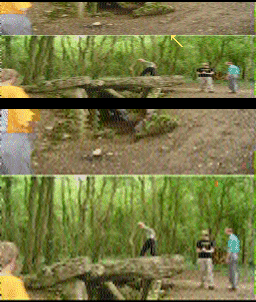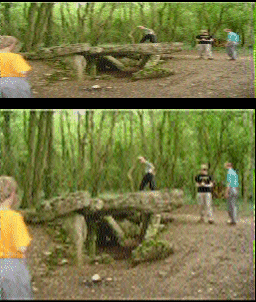 No vertical sync is transmitted, so it is very likely that when a transmission starts the first picture received will not be phased correctly - as in the first example below (left).To correct this, you simply click the mouse on the correct point, which is the top of the lower part of the image or the bottom of the upper part (see arrow). This is usually easy enough to find since most often the top of the picture is ligher than the bottom. Once you click on the image, the next frame will be realigned correctly, as in the picture on the right. Sometimes it is difficult to see where to click, so it may not be right first time. If it's not quite correct, simply click again.