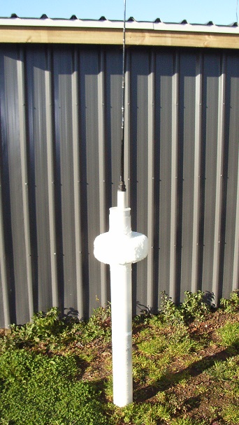 Plumbing fittings for the buoy top cap and 'fishing rod' antenna. A length of wire inside the fishing rod is connected to a 1.2m long SS whip out the top giving a total antenna length of about 2.4m. To be fed via a base loading network (L-match)