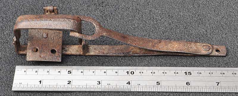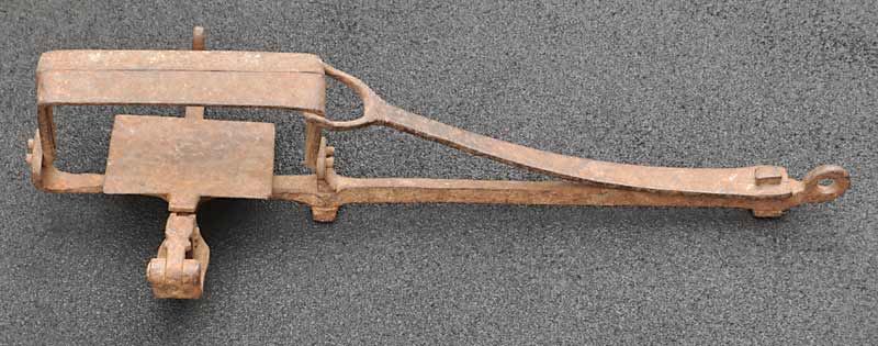 The trap above, although very similar to a rabbit trap is somewhat larger, having 6 inch jaws and an overall length of about 16½ inches, and in this case has a machine-made spring and a steel tongue and till. A larger trap such as this would have been used to catch foxes and possibly badgers, and the holes in the plate were for attaching bait.