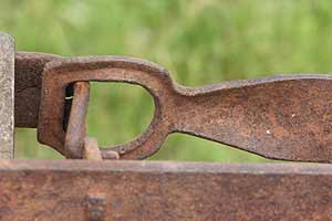 Photo 27 shows a Douglas Improved humane rabbit trap and you can see it shares some components with a gin trap. This trap differs in the way it catches rabbits: the spring is depressed and held in position by the familiar till and tongue arrangement. The outriggers either side of the plate act as anchorage points for a replaceable length of wire which would be formed into a loop. When the trap was set into the ground in the manner of a regular gin trap, the loop would protrude through the slot in the crossbar at the end of the spring, and the wire would be adjusted to merge into the undergrowth.
