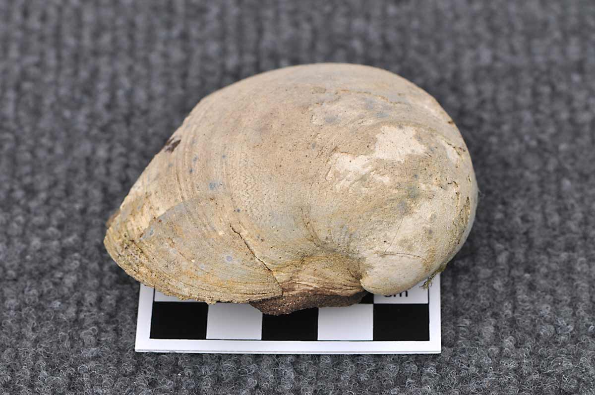 Fossil 1: a large fossil bivalve shell around 7cm across, originating from the upper greensand. Surface find, collected from the North Hill area.