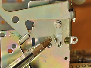 The unit seems to be well-designed and was certainly intended to last. You can just see the two light-brown bell coils in the centre of the chassis which have '500Ω' printed on them: this is the type of bell we need to have fitted. One useful design feature is the small latch that can be used to lock the cradle switch down, as with the cover off, the weight of the handset can no longer reliably do this. This is useful if work or tests need to be done on the unit with it still connected to a power source.