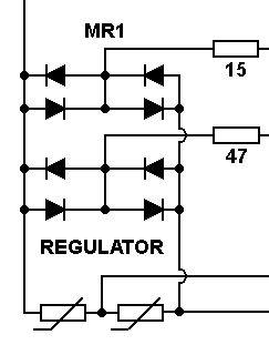 The green cylindrical component on the circuit board is a stack of 8 selenium diodes in series, with the 9 connections to them being visible on the sides. The associated pair of thermistors look like small light bulbs fitted into a black protective plastic mounting, and would be located next to it.