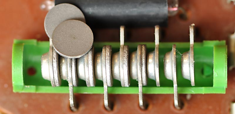 I made the mistake of frowning at one of these assemblies once, which upset it enough to make the green plastic case break under that spring pressure exposing its innards, and allowing the spring to ping forth into another dimension. So... that plastic has become brittle over the years, touch it if you dare! This did, however, give me a chance to photograph the construction of the diode stack in detail.