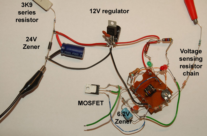 To test and adjust the operation of the circuit I used an isolating variac feeding a bridge rectifier and capacitor to mimic the output of the solar panels, which allowed me to finalise the resistor values in the divider chain and to set the hysteresis to give roughly a 10 volt switching window. A preset potentiometer was included to allow the window to be shifted up or down in voltage to enable a range of panel specifications to be accommodated.