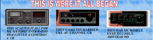 YAESU FT847 EARTH STATION 2M/4M/6M70CM/HF ALLMODE YAESU FT90R DUAL BAND 2M / 70 CM MOBILE ICOM ICT8E TRI BAND 2M / 6M / 70CM HAND HELD ICOM ICH16T PMR MODIFIED FOR 2M ICOM IC4GXET 70CM HANDHELD KENWOOD TH48E 70CM HORA C408 70CM MY FIRST RADIO YAESU MD100 BASE MIKE WATSON W25 AMP PSU KENWOOD SP31 FILTERED SPEAKER AV600 SWR/POWER METER ADDONIS AM308 BASE MIKE MFJ DELUXE VERSA TUNER 2 MODEL MFJ948 YAESU FT 730R 70CM MOBILE HORA C150 2M HAND HELD MY FIRST 2 M RADIO WATSON 300 DUALBAND BASE ANTENNA TONNA 2/ 6 / 70CM MINI BEAM YAESU VX7R TRIBANDER SIRIO 2070 2M / 70CM MOBILE ANTENNA HOMEBREW LONG WIRE COVERS ALL HF ALINCO DJX C7 WORLDS SMALLEST DUAL BAND HANDIE THE ICOM IC208 USED MOSTLY AS A SCANNER LATEST ADDITION YEASU VX2R ALBRECHT AE560 MOBILE 2M