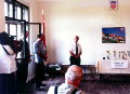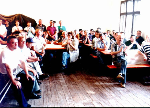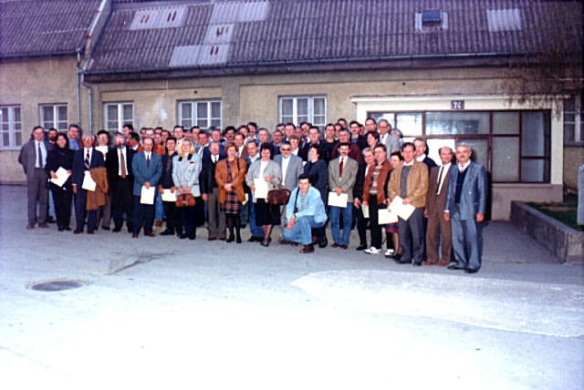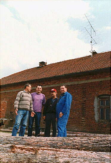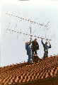 Sljede�eg prolje�a smo sve skupa napravili puno ozbiljnije. 4*17el F9FT (horizontala) i 2*9el Delta Loop (vertikala). Koliko amatera treba da se sav taj cirkus podigne na stup? Sigurno treba iskusne. (L-D: 9A3PY, 9A3TG, 9A7GMB, 9A3TN) 9A2XF poku�ava izvu�i maksimum iz svog vokca na vrhu 20m visokog tornja. Vidi se 4*17el F9FT (horizontala) i 2*9el Delta Loop (vertikalni) sistem antena za 2m na contest lokaciji Laze.