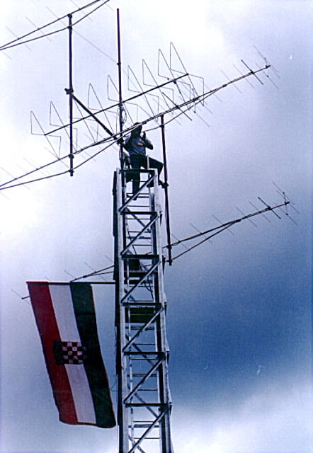 9A4P (Contest poz.oznaka) i 9A1BTU QSL karte prikazuju barokno sredi�te grada Po�ege Sljede�i izazov : 6m, tzv. magi�ni band. Ova efikasna 4-el yagica je na�injena od stare VHF TV antene za 4. kanal u par jednostavnih zahvata. Nakon prvih iznena�uju�ih rezultata na 6m, dvije stare TV antene smo pretvorili u ovaj veliki 7-elementni beam. 9A3TN i 9A9AU gledani s vrha tornja.