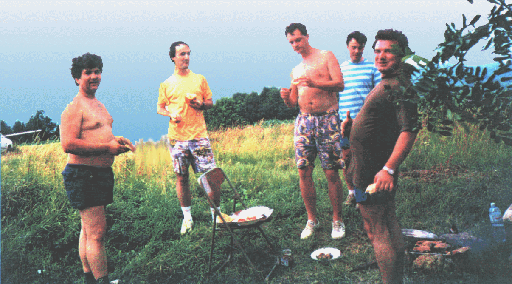 Odmah postavljamo šator i sklapamo antene. DL6WU 15 el. , 8.5m dugačka, napravljena i isprobana u istom kontestu 80-ih godina! Ponijeli smo i "elradicu" 12 el. Tu su i male antenice za paket-radio, hrpa sitne opreme i uređaj IC271E (8W), gluh ko top, ali-drugi se nema. Podižemo stup "visine" 5m i-antena je gore! Još brzopotezno mjerenje SWR-a i-juriš na ručak jer već je popodne. Tu se pokazalo da je Željko, 9A2R, zadužen za kuhinju, osim lonca odličnog graha, ponesal i jednu (1) žlicu! A nas ima šest. Hmmmm....?!