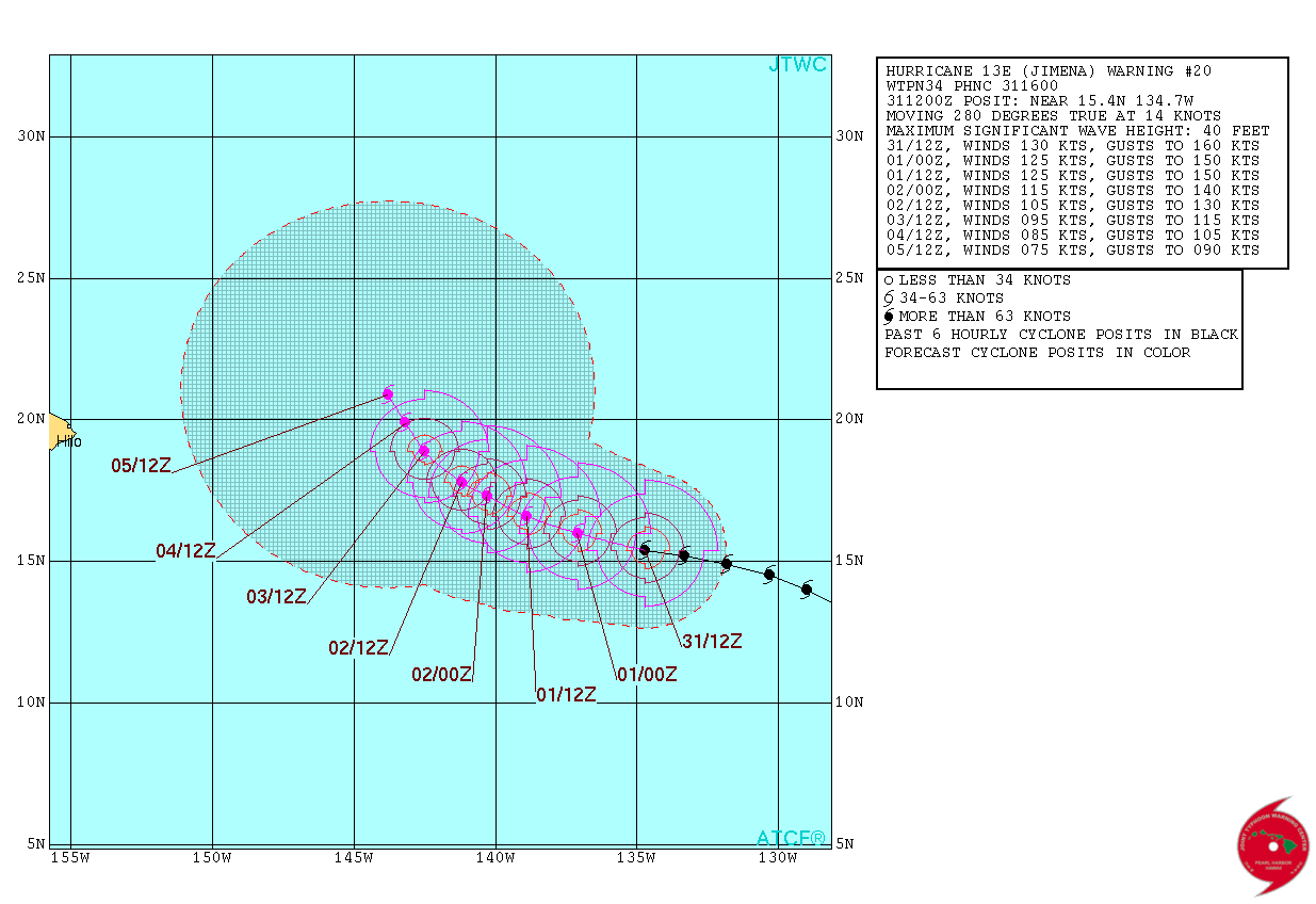 Amateur radio operators throughout Hawaii prepare to respond to Hurricane/Tropical Storm Jimena that arrives in Hawaiian waters on TBD. This page provides progress information on the event. It is updated infrequently, so check the latest advisories from the National Weather Services and Emergency Management agencies. Last update is Sun Sept 13, 12:30 pm