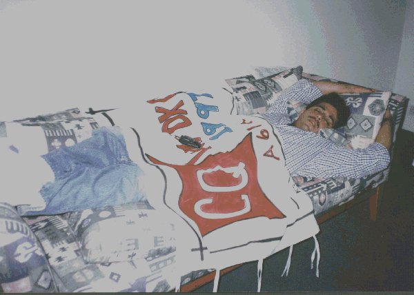 Best sleep you can get is on the sofa in the shack. Ali's Brother Abubaker covered with CQ WW CW 1997 banner