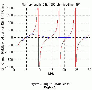 An antenna system is more easily interfaced to a radio when the input reactance at the feedline terminals is low or close to series resonance. If a center fed dipole is fed with a length of low loss balanced transmission line, the input reactance is a function of both transmission line length and antenna length, and to reduce the reactance at selected frequencies there are optimum lengths of dipole and feedline. The G5RV antenna design is an example of selecting these lengths to produce near-series resonances at amateur operating frequencies from 3.5-28MHz. There are other combinations of feedline length and dipole length which reduce the overall reactance as shown below. The red regions of Figure 1 have low RMS reactance over the frequencies shown to the right of the figure.