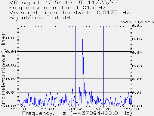 Starting on November 25 1996, when the MGS was 5 million km from the Earth, the MR 437 MHz transmitter was tested, putting 1.3 W into a near-isotropic antenna. Radio amateurs were invited to try to detect the carrier of this transmission during the several hours when it was active. Several hundred radio amateurs took part in the test, which was coordinated over the Internet. Below are shown some of the results from AA7FV during this test. The antenna (a single 15 element Yagi) was probably one of the smallest used anywhere to receive the signal, but relatively high signal-to-noise ratio was achieved by narrowing down the bandwidth to just over 0.01 Hz. This required some special techniques, which are outlined, with some of the results, below.