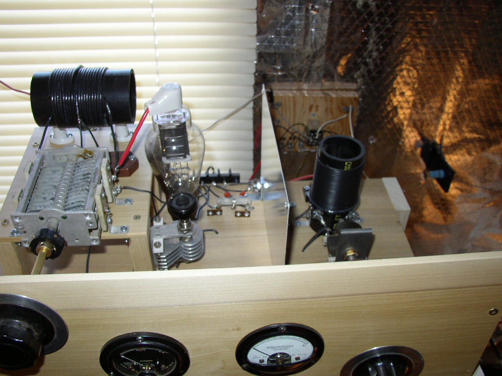 View of the power amplifier. At the left is the 809 tank circuit and neutralizing capacitor. The plate circuit is shielded from the grid input circuit by a piece of grounded aluminum sheet. The grid input coil is visible to the right of the shield. Note that the tank circuit is built on a small platform to keep lead lengths short.