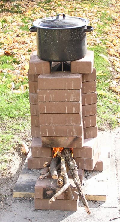 I decided to try making a stove from brick, as brick can be obtained almost everywhere. As in the previous design, the retail cost is under ten dollars. The "paver" bricks that I used are available at most large hardware or landscaping supply stores in this country. They are often on sale, especially in the summer, for 30 to 40 cents apiece. Hand-made bricks could be used also. They may not last as long as fire brick, but these stoves don't need to last for years. After trying a few different combinations, I settled on the design on this page. It can be assembled in a matter of minutes. Another course or two of bricks in the chimney couldn't hurt. This stove has much more thermal mass than earlier designs and will take a little longer to heat up, but it will keep the coals hot and retain heat for quite a while after the fire goes out.