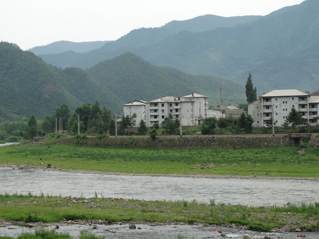 Closeup of some of the decrepit concrete buildings of Namyang viewed from across the river in Tumen.