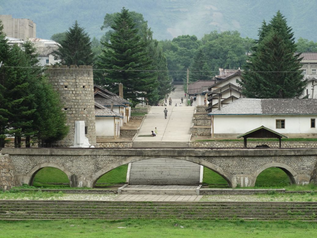 Striking North Korean immigration and customs buildings in Hoeryong. The facilities were built with Chinese money, but at present China and North Korea are in the midst of one of their periodic feuds so the border crossing was completely quiet on the day that I visited. No people were visible anywhere, and no sounds were to be heard. The two trucks sitting on the bridge remained idle, no telling how long they had been waiting there.