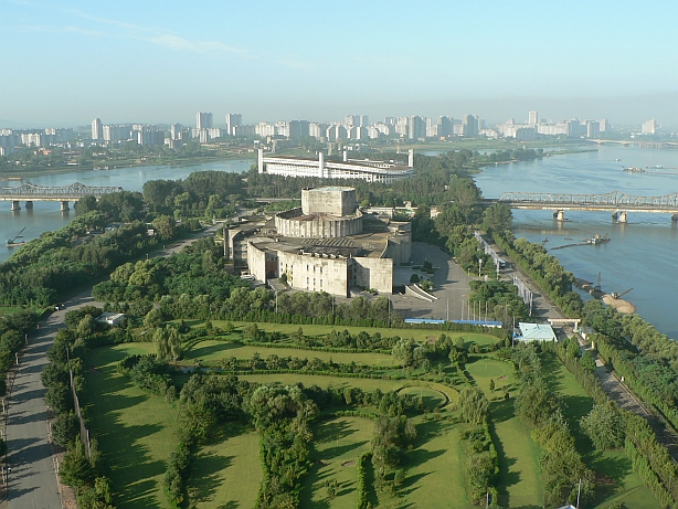 Pyongyang is North Korea's capital and showpiece. Americans are typically housed at the Yanggakdo Hotel, a property on an island that is an easy place to confine foreigners to. We were allowed to walk around the hotel grounds but were forbidden from crossing the bridge into the city when not accompanied by a guide. My first instinct was that the North Koreans might try to hide the city from our prying cameras and give us rooms with little or nothing to see, but the opposite was true: they made sure we were deposited in rooms with the best possible view. At first I was tentative taking pictures from my hotel window, but after a few minutes I relaxed. In a country as tightly-controlled as North Korea, I reasoned that there wasn't anything visible from my hotel window that they didn't want me to see.