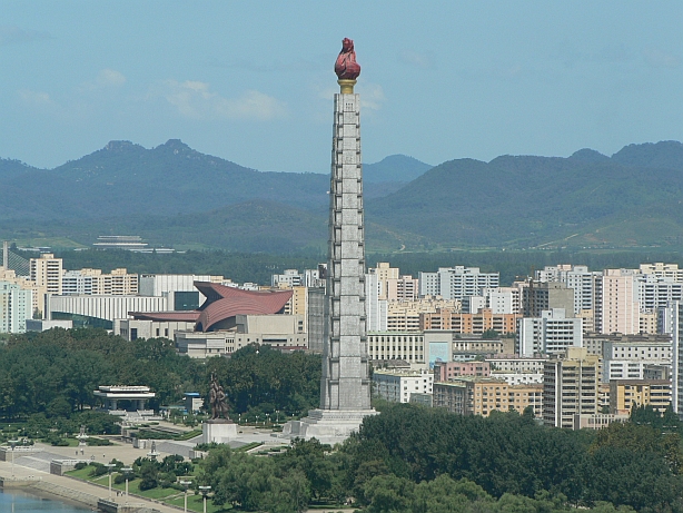 The Juche Tower, monument to North Korea's Juche (Self Reliance) philosophy. Our guides took great pride in pointing out that it was taller than the Washington Monument. They seemed very disappointed that none of us knew how tall the Washington Monument was exactly, because they were clearly waiting to give us the stats on the Juche Tower to prove how much better theirs was than ours.