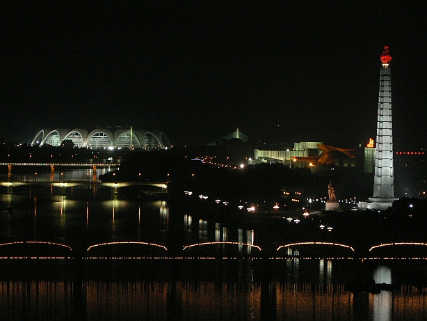 For fun, I decided to set up a tripod on our window sill and take a picture of Pyongyang during the middle of the day (first shot) the exact same shot at night (next shot), and finally a third time at roughly five in the morning at sunrise. The Juche Tower is to the right, and off in the distance is May Day Stadium, the site of the Mass Games.