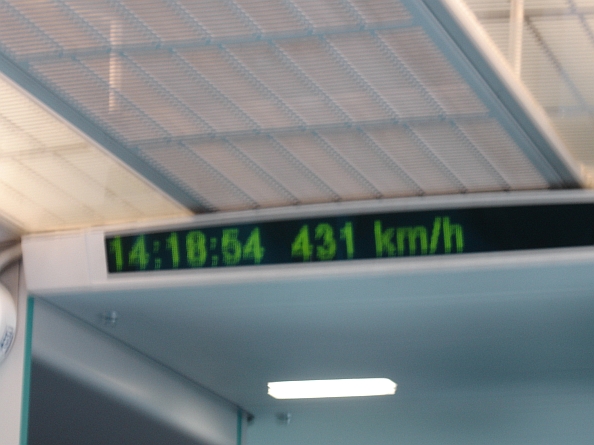 Leaving the city in true style aboard the city's maglev (magnetic levitation) train that soars at more than 268 miles an hour (431 km/h). The trip from Pudong Airport to the city center took well over an hour when we arrived by cab; the trip back to the airport aboard the maglev train took a mere 7 minutes! The train travels so fast that photographs inside, like the one below of the digital monitor showing our current speed, all seem to have the effect of being slightly blurred and warped by time travel!