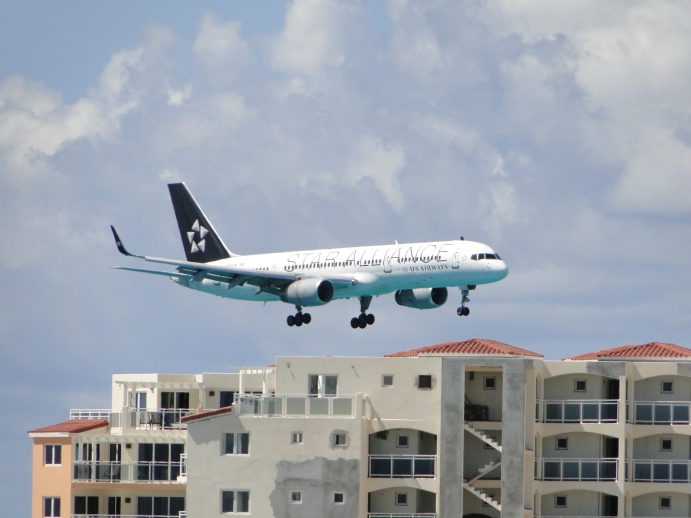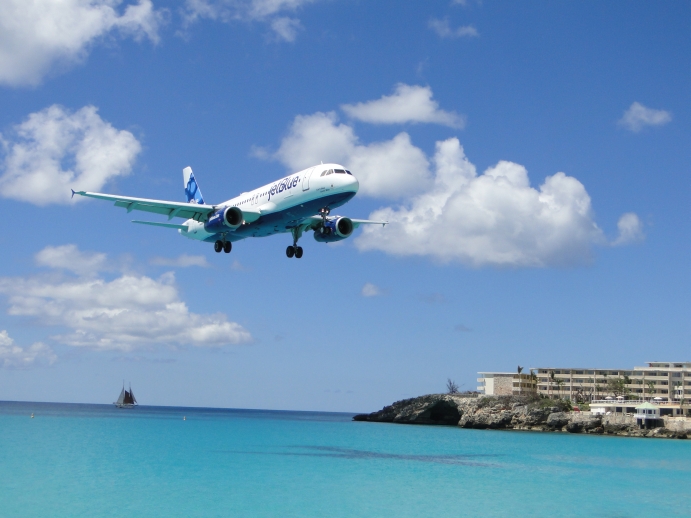 JetBlue arrival over Maho Beach. St Maarten is of the only airports in the world that lets you get this close to active aircraft. The runway here is much shorter than most international airports because of the ocean on one side and mountains on the other, so incoming planes have no choice but to land low and hit the runway as soon as it starts to make sure they have enough room left over to slow down...