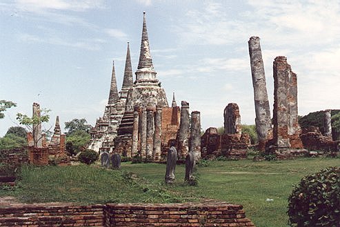 After the old capital of Ayutthaya was sacked by the Burmese in the last century, Thai leaders abandoned the site and moved south to today's present capital, Bangkok. The contrast between the haunting decayed spires pictured below and the glittering gold versions of today seen in the photograph above is positively eerie.
