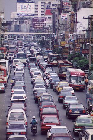 A study in contrasts, Thailand is where I was first exposed to the teachings of Buddhism, a fascination that still captivates me today. On the left, one of the glittering gold Buddha Images found in the Wat Po temple complex. To the right, the very opposite of meditative tranquility: rush hour in Bangkok, said to be the worst traffic anywhere in the world.