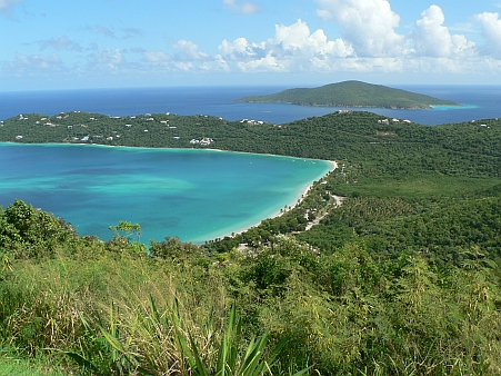 The famous lookout from Mountaintop, the highest point on St Thomas. Here, islands from both the British and US Virgin Islands fill the view. In this shot, St Thomas is in the foreground, St John in the upper right, and Tortola (BVI) upper left.