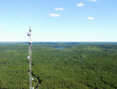 Looking to the east at the Bell Canada tower. The right horizon of the picture looks towards Dryden, 26 miles from the Camp Robinson site. The VE3DRY repeater will remote base link to VE3VBY, allowing the two repeaters to be connected for further range to the northwest.