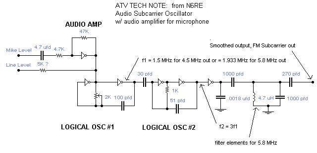 A single IC provides all amplifiers: 74HC04 Hex Inverter ( a digital element).The 2nd oscillator synchronizes to 3 times the 1st oscillator and thereforethe FM deviation is tripled. Using the lower freq f1 oscillator also enhancesfrequency stability.