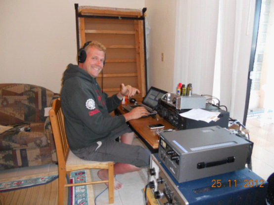 图片:最后一分钟留念。OH6RX早上引起了美国的pileup。请注意发红的双脚。问题...什么在赤道上的30 +度的温度里还穿厚长袖衫?答:严重烧伤后开始感觉冷。请注意,前面的图里有同样的现象。