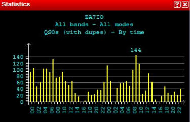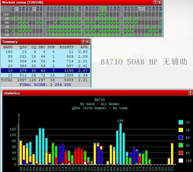 下午回来后,我决定要扭转形势,如果没有基数,再多的系数也没有用,特别是有些人光看QSO个数,虚荣心作怪,决定下午不管系数了,使劲RUN一把,没想到俄罗斯人很配合,12点多,俄罗斯台一个接一个进来,几乎都不间断,有些人认为中午1点钟是垃圾时间的论断不攻自破,RUN了2个多小时,心里不安起来,觉得这样做可能有点过火,于是开始搜索系数,并转换波段看看运气。下午15米对非洲的传播相当不错,到北京的信号都是Real S9,两天下午的15米,5H,5R,9J,A2,C9,D2,ZS等,基本上都是一遍叫通。到了5点多以后,北京已经很黑了,按照原来的打算,第一天的40米放在晚上8点以后再开战,5点半到8点的时间留给80和160米,因为这个时间是160米和80米对北美的窗口时间,如所预料的一样,除了无处不在的日本台以外,80米通到不少找上门来的北美电台,而160米,也收获了一个北美的系数。到了接近晚8点时数数看已经有700个台了,准备去40米RUN了,心里还是没底,这个凑合的DP能不能完成任务?开始半小时后,这个顾虑就打消了,虽然F/B不好,但看反映来说,效果还不错,就像钓鱼一样,大的没有,小的也将就。中间插了一小段时间的80米和160米,一直到晚上1点左右结束,结束的时候,看了一下QSO数目,大概1000多一点,离预想的QSO数目要少一些。第一天晚上1点到4点睡觉,4点起来后,感觉40米不错,懒得去看别的,一直在40米上呆到天亮。这可能是一个错误,如果能在这个时间段适当看一下160米和80米,第二天就不会有那么大的压力了。第二天的早上快到9点,干扰消失,于是在20米上呆了2个多小时,然后转到15米,期间做了一次身体活动,在活动的时候,把机器放在10米,不断呼叫,天线在ZL,VK,9M等方向转来转去,20分钟过去了,没有任何回应。