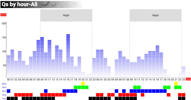 160米我的操作策略是收掉近处的系数。因为远处的系数要花费很长的时间确认,从系数贡献度的角度有时候不太合算,所以重点没有放在这个波段,只在周六的晚上主叫了一段时间,周日晚上主叫时间很短。最后得到了Z11, D13。如果做M/M或单波段,48小时50-60个DXCC应该可以达到。